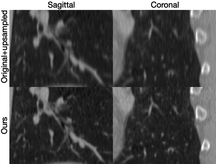 A self-supervised approach utilizing off-axis training to improve the resolution of through-plane CT scans.